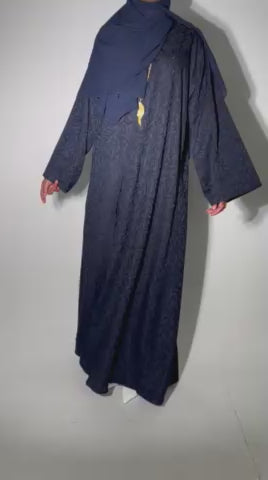 The abaya is buttoned all the way down for practicality and style, and it comes with a matching navy blue chiffon scarf to complete the look. Perfect for occasions when you want to look polished with minimal effort.
